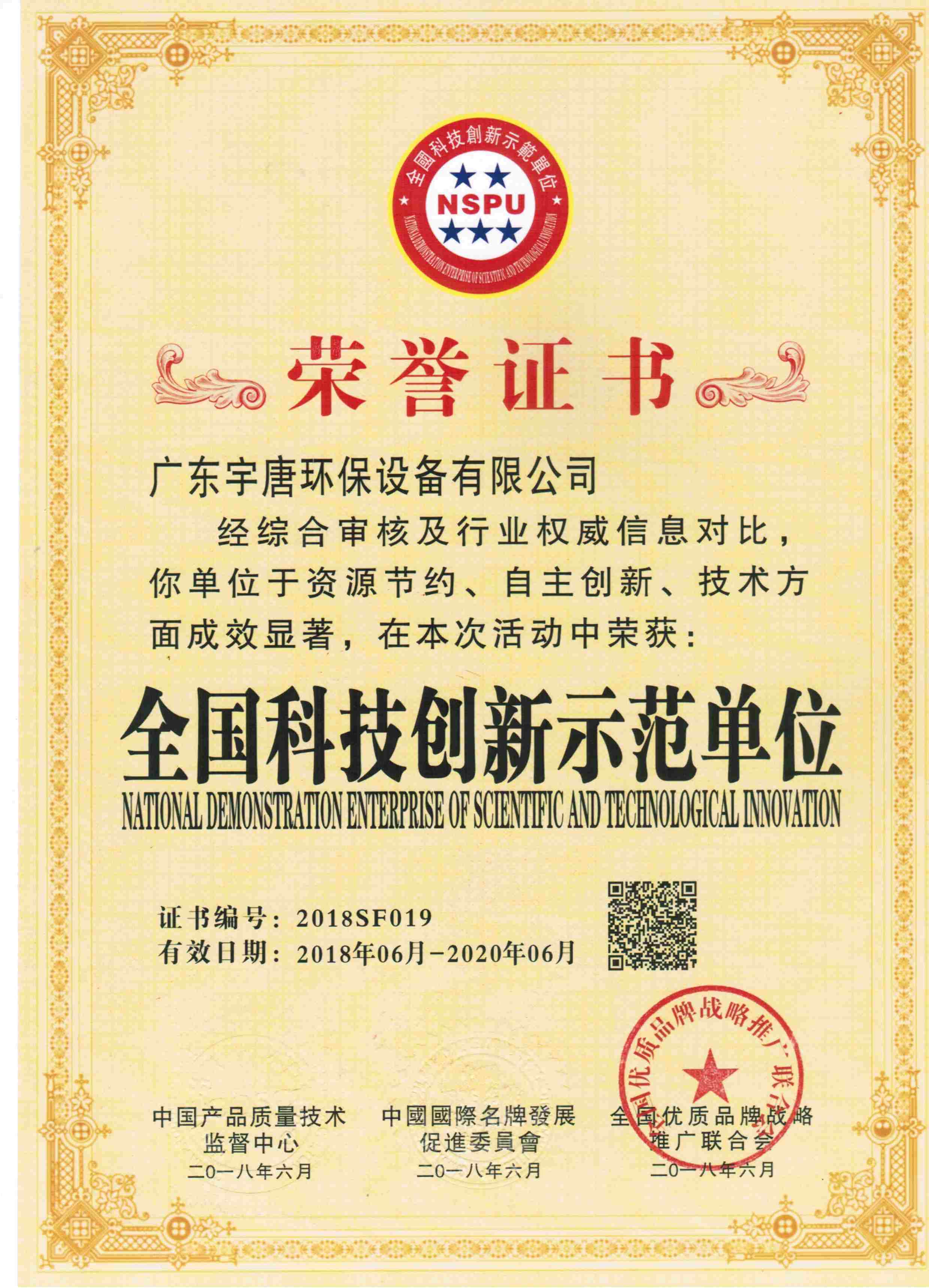 全國科技創(chuàng)新示范單位榮譽(yù)證書