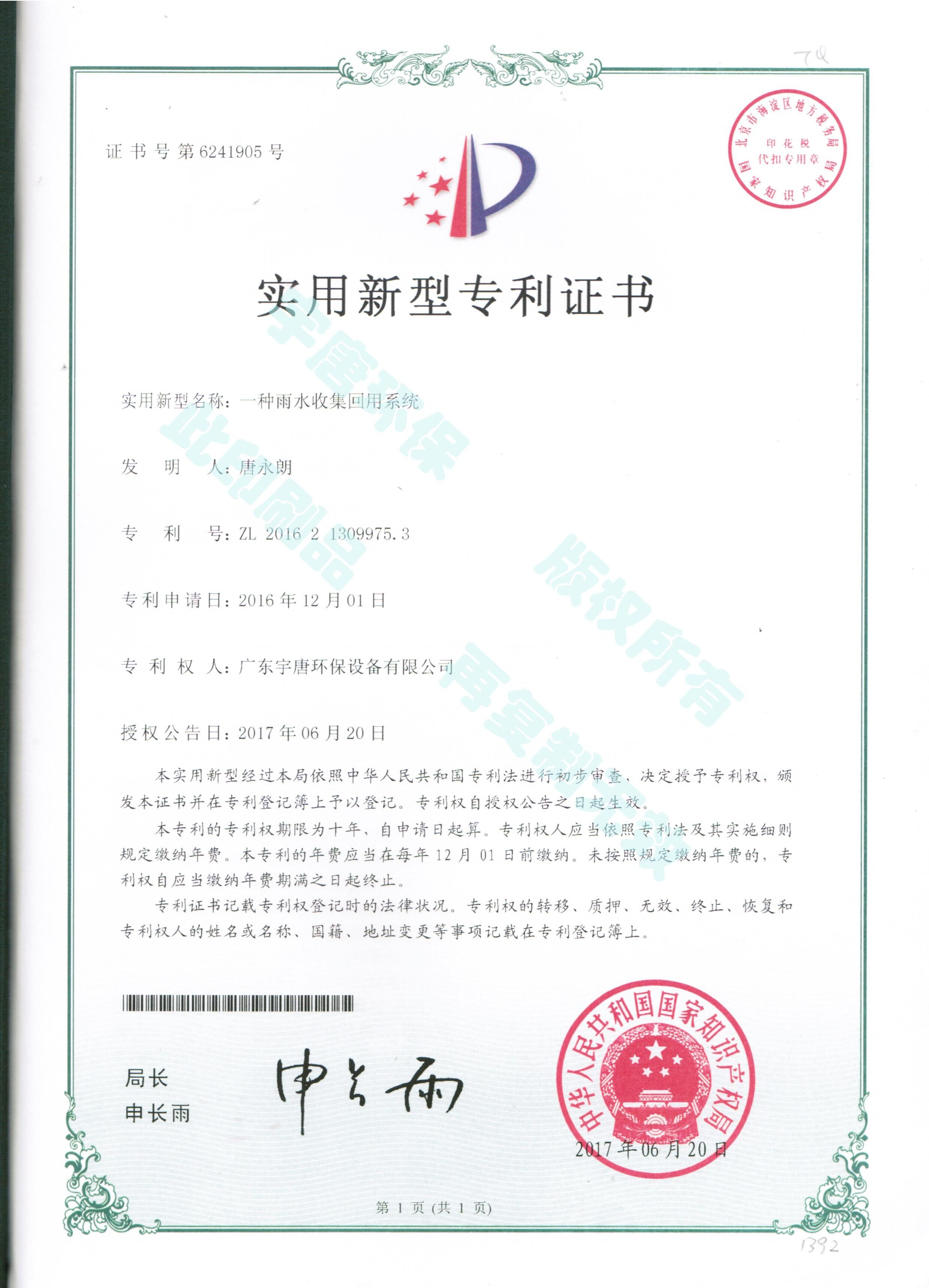 一種雨水收集回用系統(tǒng)實用新型專利證書