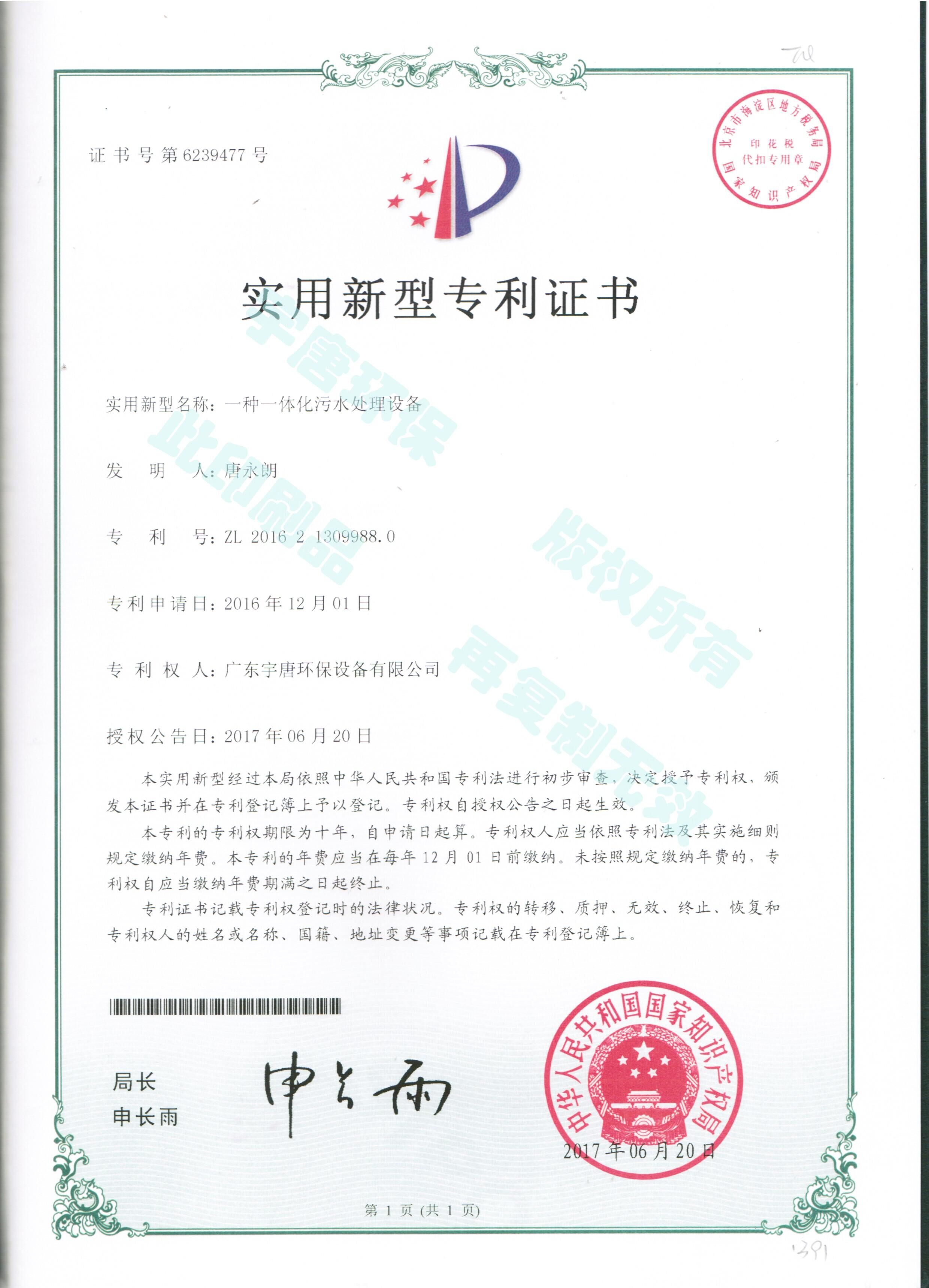 一種一體化污水處理設(shè)備實(shí)用新型專利證書